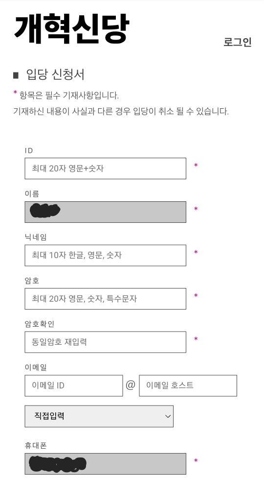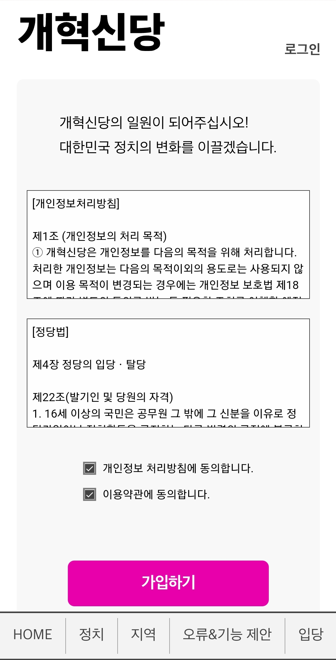 개혁신당의 일원이 되어주십시오! 대한민국 정치의 변화를 이끌겠습니다. [개인정보처리방침] 제1조 (개인정보의 처리 목적) ① 개혁신당은 개인정보를 다음의 목적을 위해 처리합니다. 처리한