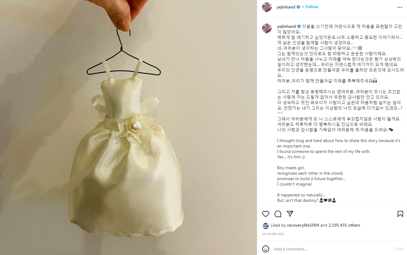 10일 손예진은 자신의 인스타그램에 "예쁘게 잘 이야기하고 싶다. 너무 소중하고 중요한 이야기"라며 "남은 인생을 함께 할 사람이 생겼다"고 남기며 결혼을 알렸습니다.